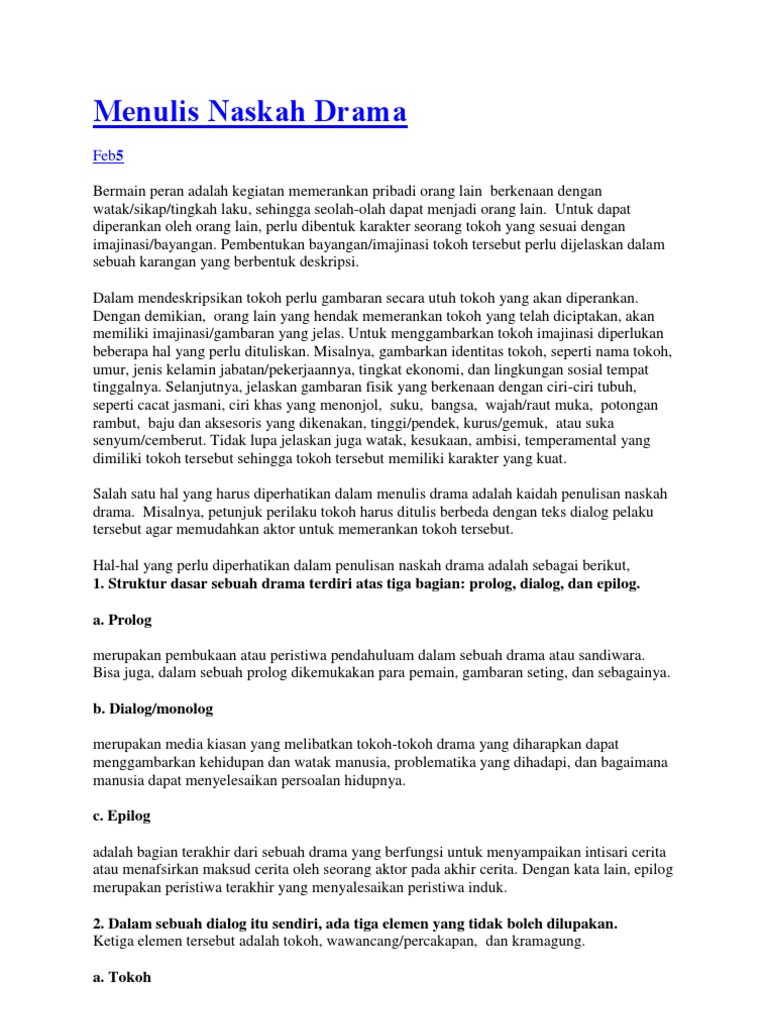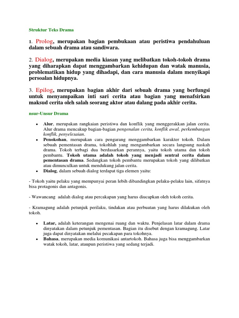 Prolog yang merupakan pembawa sebuah teks sering disebut sebagai pembuka untuk sebuah drama yang isinya adalah alias dari pendapat penulis yang berbeda tentang kisah drama yang disapapabilan. TEKS DRAMA adalah materi bahasa Indonesia yang akan kita pelajari kali ini. Struktur Drama Berikut merupakan 3 struktur drama.